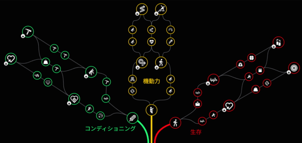 サバイバルは危険時に耐久力や機動力をバフするものや、一部探索での報酬をアシストするものがあります。ダウンを回避したり、騒音を減らしてそもそもの接敵を避けるものなどがあり、特にソロには人気です。