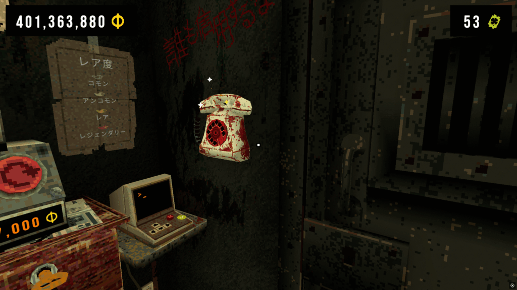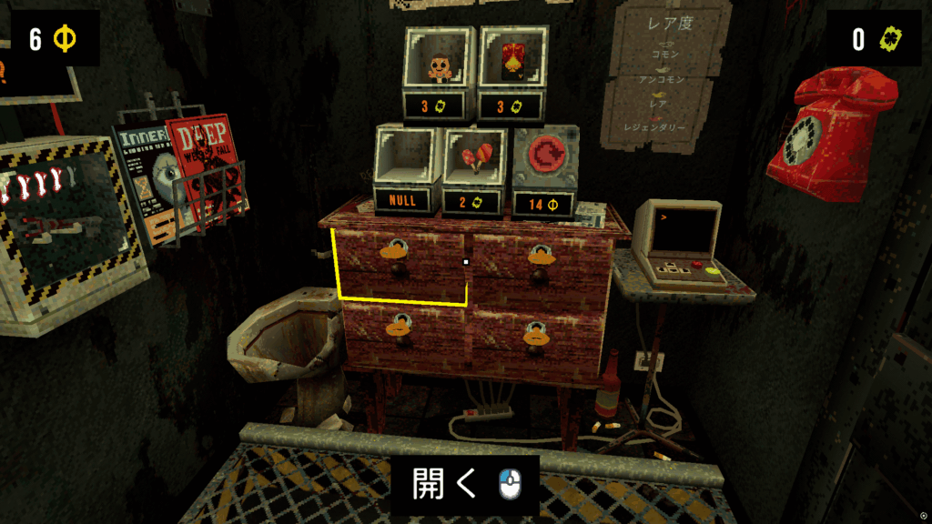 引き出しを4つ解放すると、赤い文字の電話が出現し初めます。こちらをギャンブルに誘うように喋りかけてくるもので、ステータス効果内容も良い効果と悪い効果が合わさったものになっています。