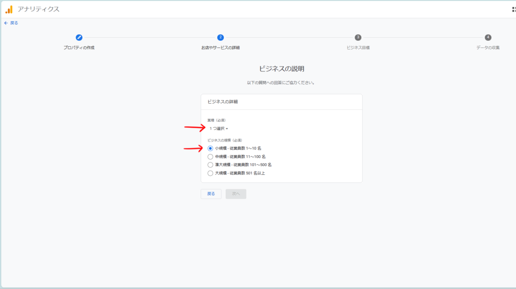 業種とビジネスの規模を設定します。個人で運営している場合、ビジネスの規模は小規模を選択します。