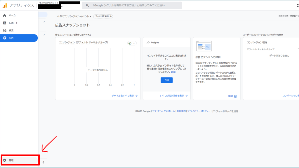 Google Analyticsの左下にある 歯車マークの【管理】をクリックします。
