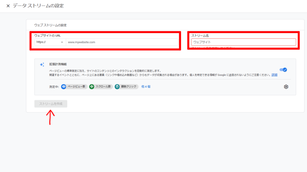 ウェブサイトのURLとストリーム名(サイトの名前)を入力します。最後に左下のストリームを作成をクリックして終了です。