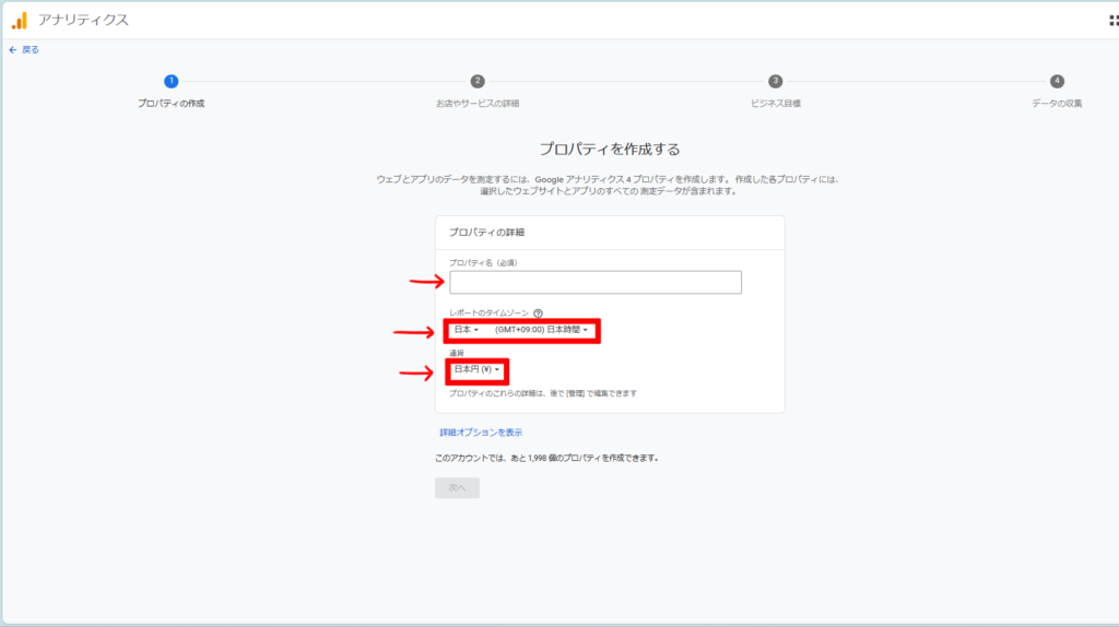 プロパティ名と時間設定や通貨を設定します。日本で設定しましょう。