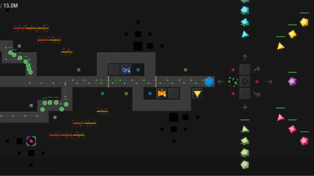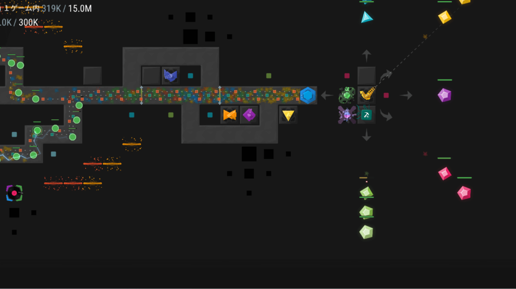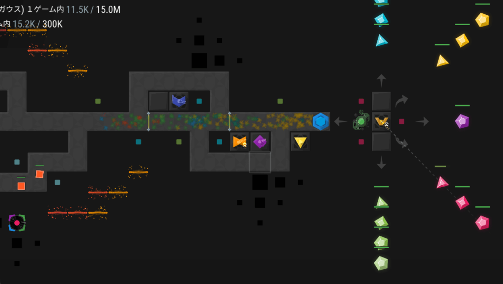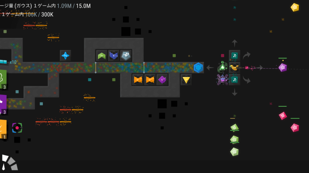 黄色は分かりやすく強化につながるのでとても良いですね。タワーを強化して少しずつ処理能力を上げていきます。