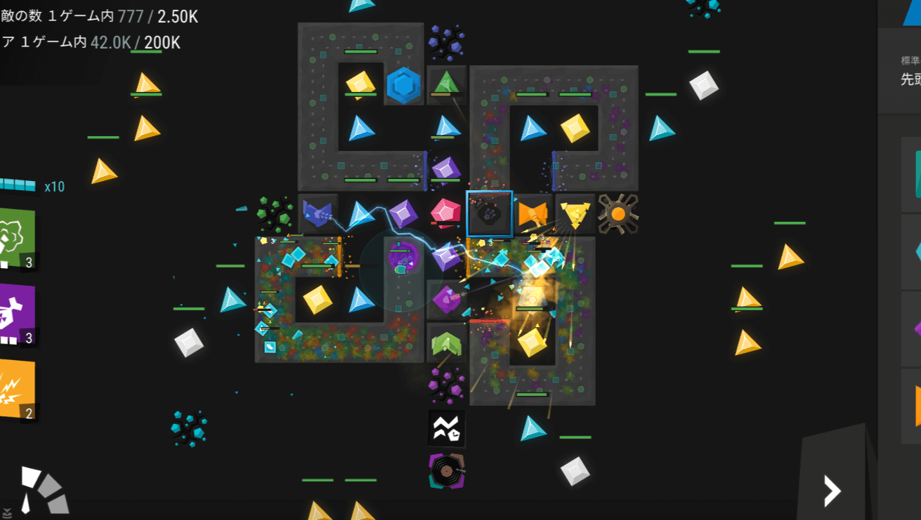 かなり配置できるタワーの数が増えてきました。火炎放射器やミニガンなども増やして殺傷力を上げていきます。中心に近い宝石からは画像のように、能力付きのタイルが出るようですね。