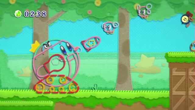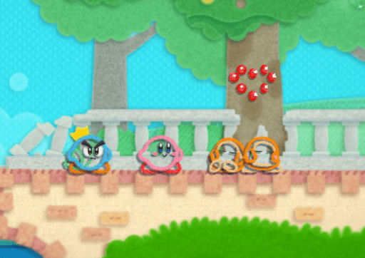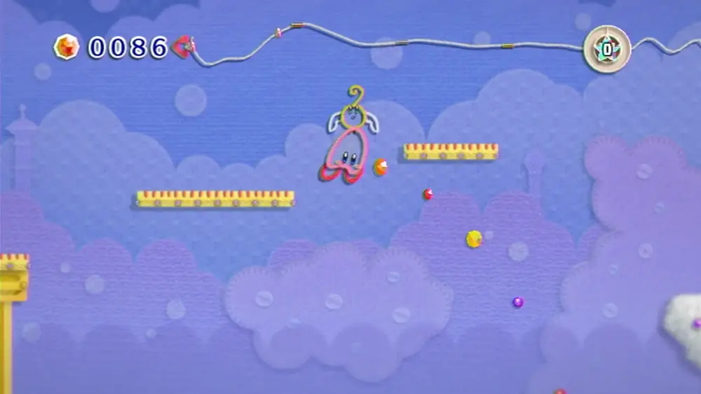 本作は、カービィもその友達も敵も世界さえも毛糸になった世界での冒険となるのですが、まず、残機がありません。このことから何となく察しはつくと思いますが、このゲームにはライフの概念がなく、落下死もありません。つまり、ゲームオーバーすることはありません。落ちたり挟まれたりしても「エンジィ」が助けてくれ、毛糸のカービィ プラスではゴールまで連れて行ってもくれます。