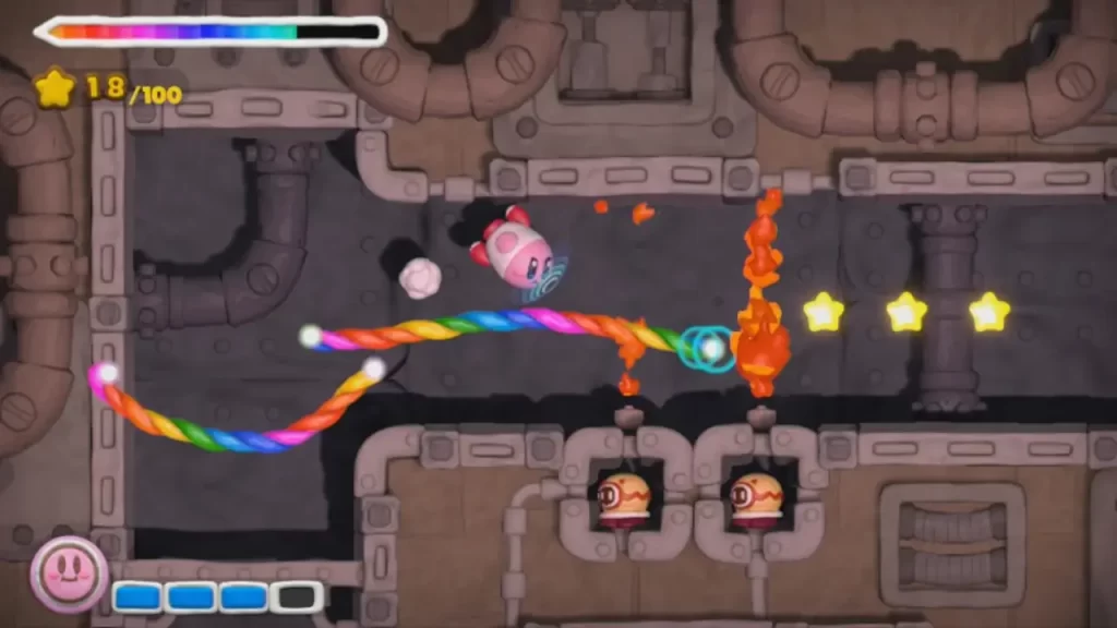 [4-4]カインバーニングを持っていくためにコピーの星が消えやすい水中にて、コピー解除→ブロックすいこみ→吐き出し→コピー能力星ほおばり→再度コピー→再度コピー解除→ブロックすいこみ、、、という意味がわからないテクニックを繰り返す必要があります。他にも強制スクロール中で行く必要があったりと様々。