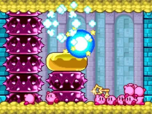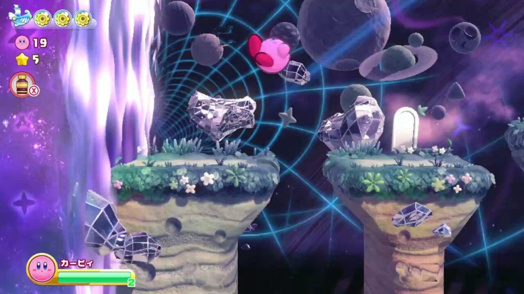 [7-7]ほぼ全種類のコピー能力壁が存在。用意されている2~4つのコピー能力から1つ選び先へ進み、2種類のコピー能力壁に阻まれた扉から1つ選ぶ必要がある。さらにこれを5回繰り返し、全てで正解の扉に入る必要がある。また、後戻りができないため能力と壁が一致しなかった場合は何も出来ずに真上の扉に入る(虹のしずくは所得できずとばされる)。ミスった場合はステージをやり直す必要がある。(唯一カインスパークで前のエリアを照らせばヒントが有るが、そのヒントを得るためのヒントはないため頑張る)