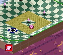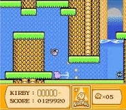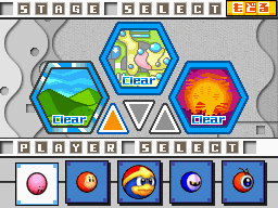 カービィゲーム定番の高難易度スピンオフ作品の1つです。カービィゲームとしては4つ目のゲームであり、スピンオフ作品としては2つ目のゲームということで、高難易度の先導者となります。ボールとなったカービィの角度と強さを決めてショットし、敵キャラクターを倒し&カップインすることでステージを進めていきます。カービィは4メータを所持しており、1ショットするたびに1つずつ消耗していきます。ただし、敵を1体倒すか、ゴールにカップインすると1メーターずつ回復させることが可能です。