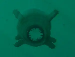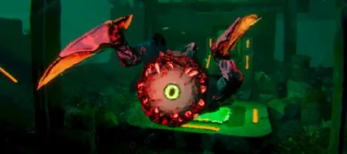 プレイヤーに対して敵対的な生物です。通常時は丸まった姿勢で眠っています。プレイヤーを発見し、目が覚めているときは、刃と足を使って泳ぎます。足はカエルのように動いて追いかけてきます。カエルのような動きをしている生物が居た場合はこいつです。