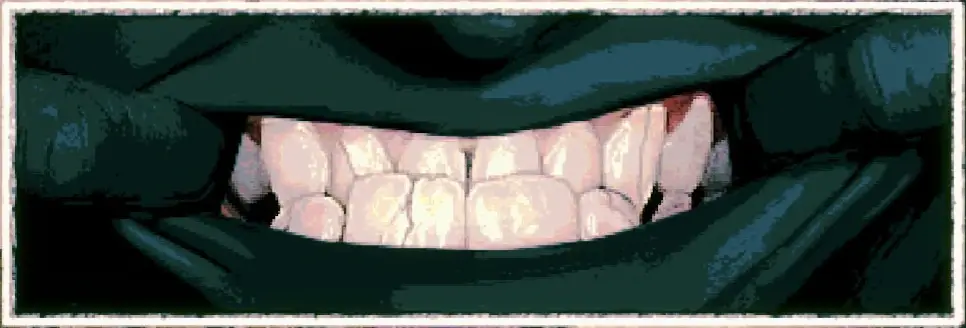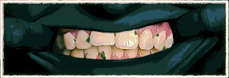 人間の場合はあまり見たくない姿をしていますが、来訪者の場合はかなり歯が白いです。また、来訪者の場合は噛み締めによるものなのか、歯がいくつも割れています。