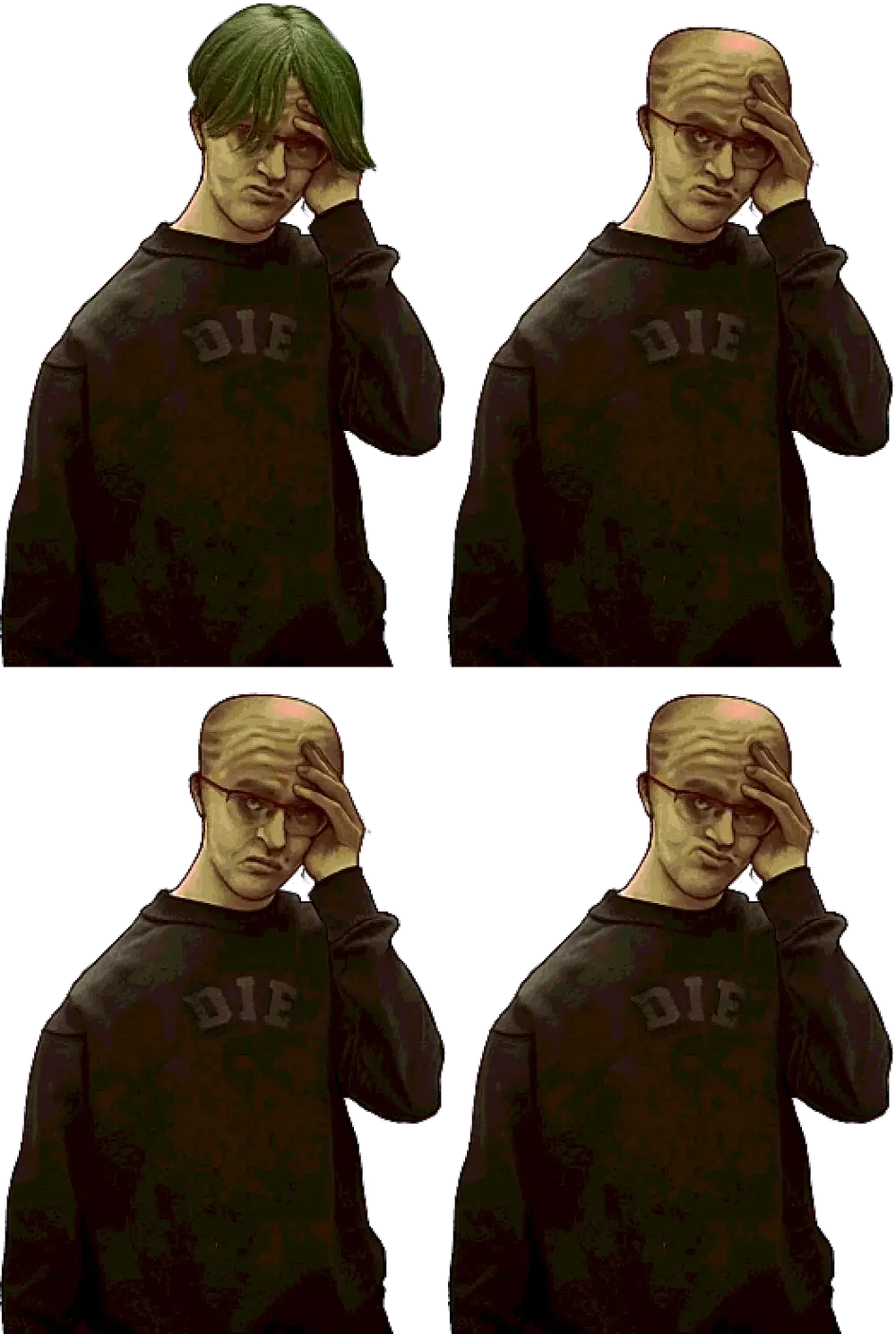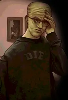 脱毛症の男はシワのある髪のない頭が特徴で、DIEと書かれたシャツを着ています。人当たりはよいですが、かんはり臆病な性格です。