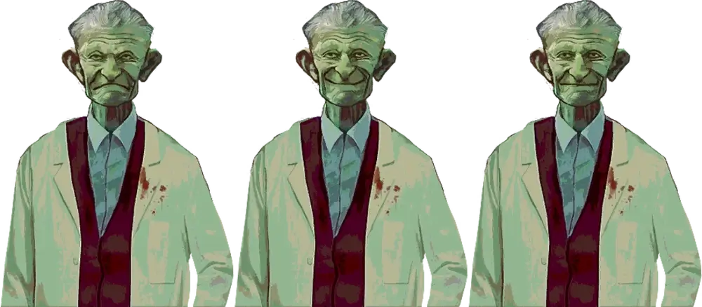 外科医はポリコリアを患っており、瞳孔が2つ見られます。詳しくは識別の「目」↓