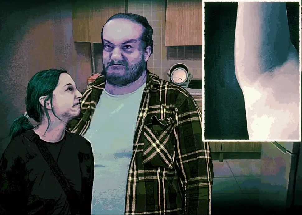しかし、人間の彼には妻を殴っていると思われる、手の甲の打撲傷があります