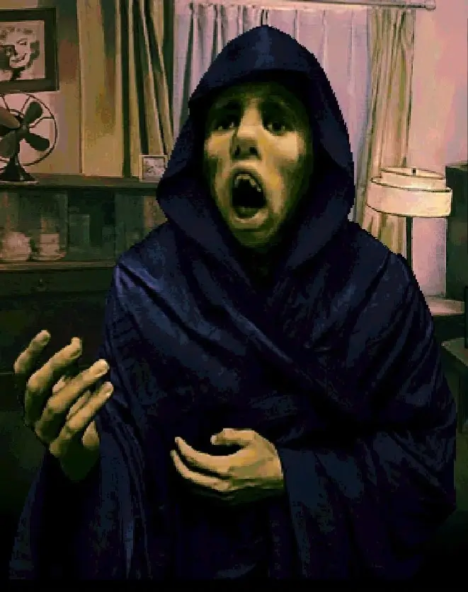 死の教祖によって連れてこられ、家に入れることになります。家に入った翌日の夜、プレイヤーがオフィスのドアに近づくと、儀式的な言葉を唱えるのが聞こえます。