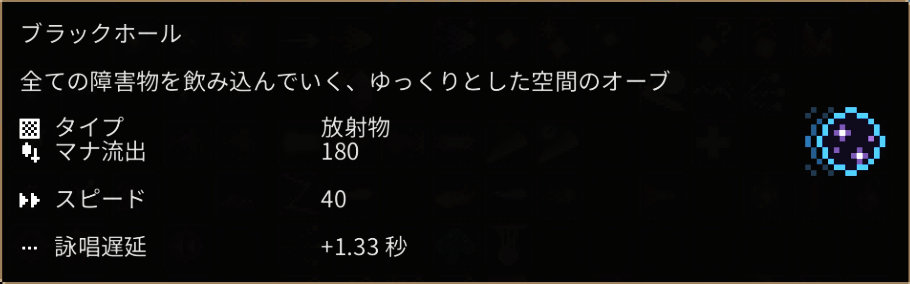 まっすぐ進むブラックホールを召喚します。攻撃性能は無いですが地形を丸ごと飲み込んで進むのでショートカットに便利です。