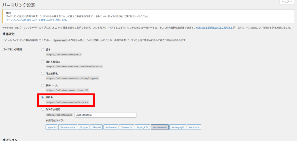 また、初期のままの設定だとURLが無駄に長くなってしまいサイトを閲覧する側も、管理をする側も手間です。途中で変更すると掲載順位が上がっていても、また0からになってしまうので早めに設定しておきましょう。