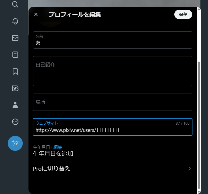 X(Twitter)の場合は自己紹介にリンクを張っても良いですし、下の画像のようにウェブサイト欄に貼ることも可能です。同様にインスタ、ライン、友達などに自分のPixivを共有できます。