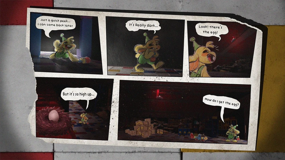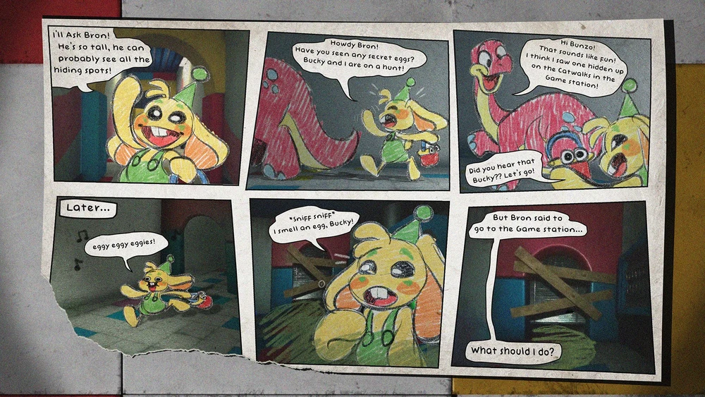プレイタイム社の工場に隠された秘密の卵を見つけようとするブンゾウ・バニーを紹介するイラスト入りコミックのコマ連作があります。プレイタイム開発者のTwitterで全てを確認できます。