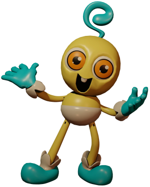 ブンゾーバニーはまん丸の黒い目と2本の大きな出っ歯、長い耳を持った黄色いウサギのキャラクターです。