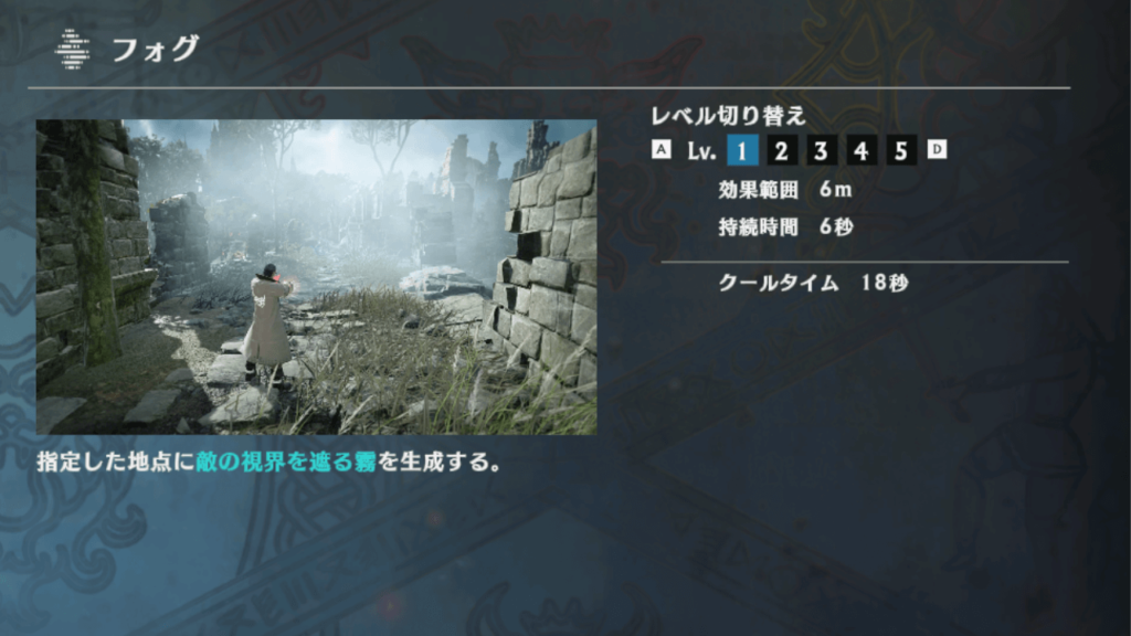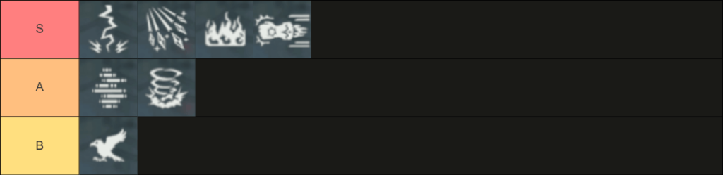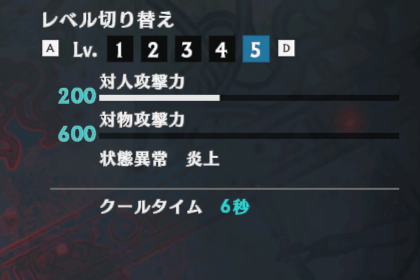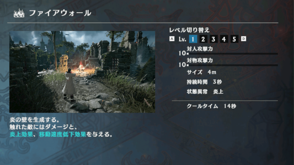 相手の接近を防ぐことができ、盾持ちに対しても通るスキル。複数回ヒットすれば炎上によって更なる隙が作れる。レベルが上がることによる恩恵も大きく、より牽制スキルとしての強みが活かしやすくなる。