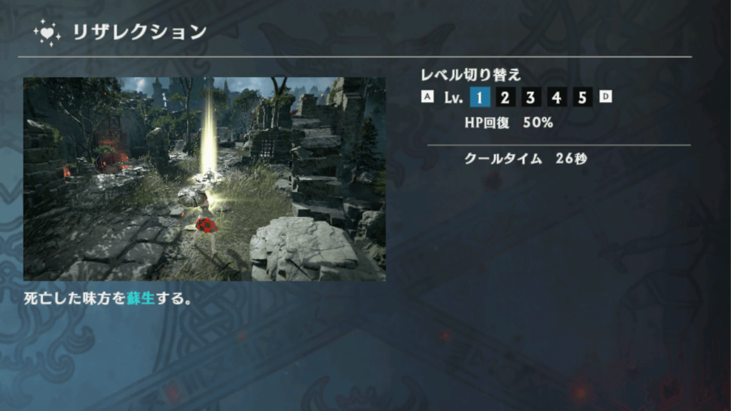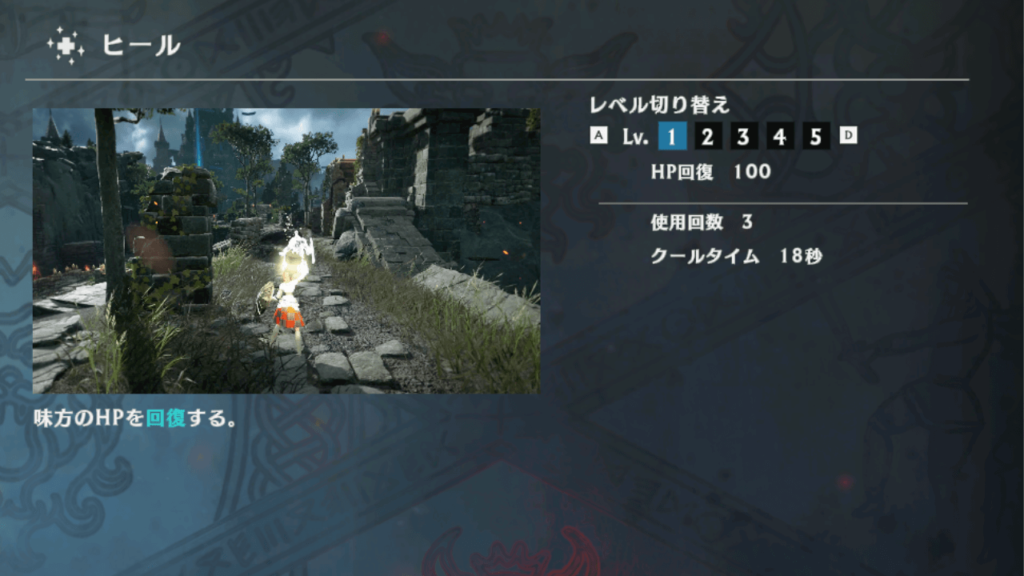 複数回使用できるため、ある程度回復をばらまける。結局クールタイムは長めで、自信を回復できないためエリアヒールより採用されることは少ないが、持っておいて損はないスキル。