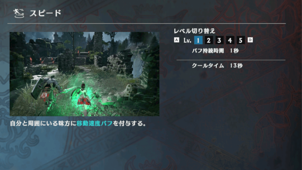周囲の味方と自身の移動速度を上昇させるバフスキル。