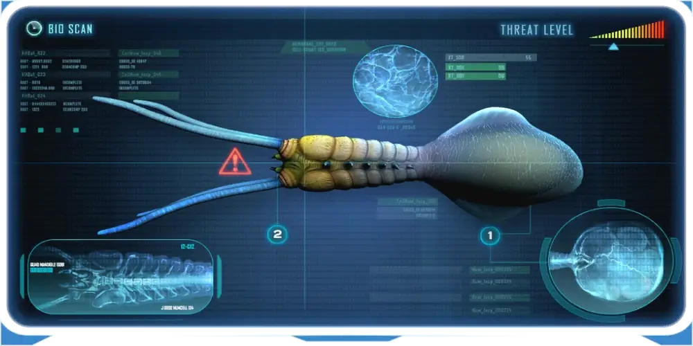 このリヴァイアサンは4本の強力な大あごで獲物を固定し、あごの届く範囲に引き寄せることができる。模擬圧力はシーモスの破砕抵抗を超える。