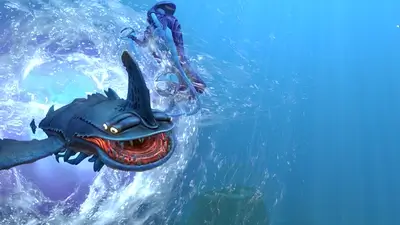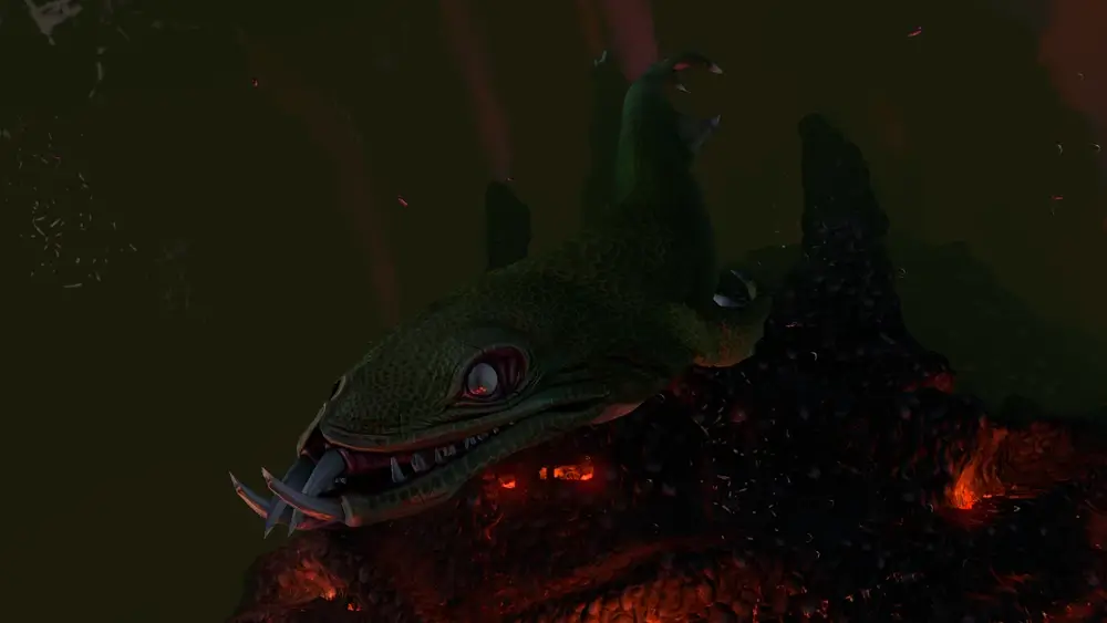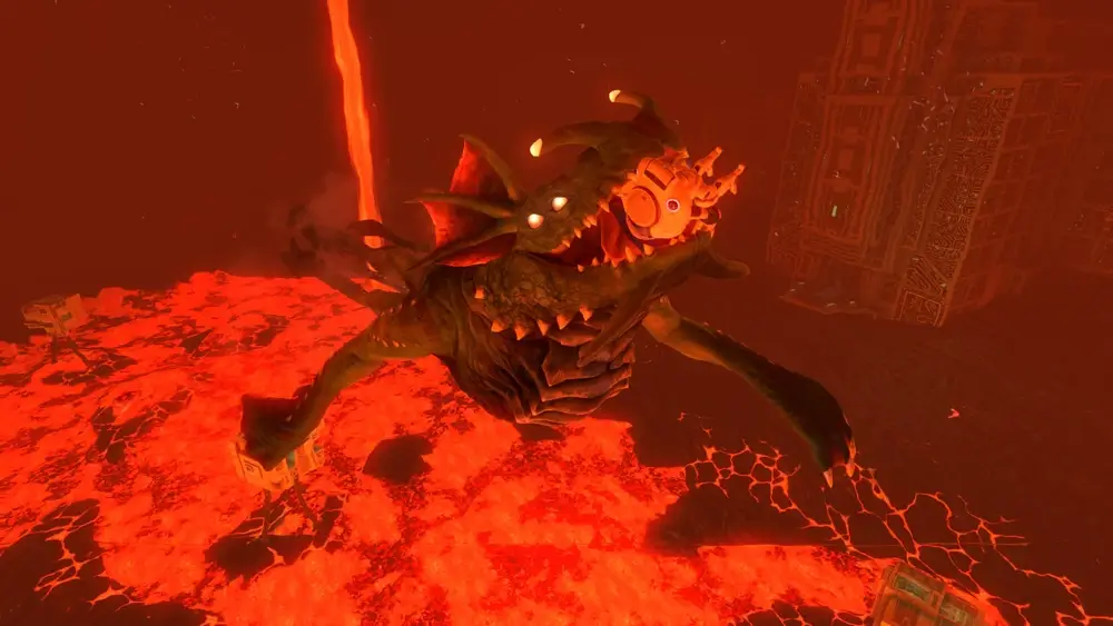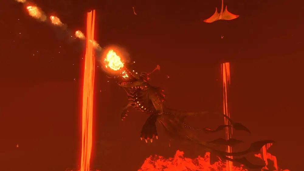 シードラゴンリヴァイアサンは、腕と触手を使って水中を高速で泳ぎます。シードラゴンリヴァイアサンが口でプレイヤーを攻撃すると、プレイヤーを飲み込み、ダメージを半減させる強化ダイブスーツを装備していても即死します。時折、シードラゴンリヴァイアサンは口を大きく開けて、溶岩を標的に向けて発射します。また、広い範囲に散らばる「火の玉」の弾幕を発射することもできます。