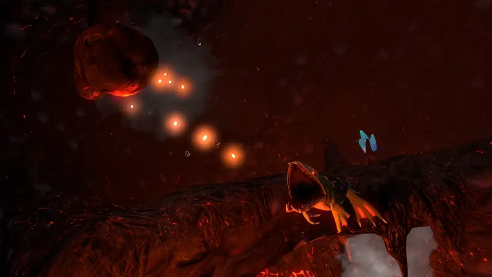 倒すことができず、攻撃は生身はもちろんシーモスに乗っていても即死します。幼体の噛みつきもプレイヤーであれば即死させます。噛みつきはサイクロプスすらも持ち上げて、口から炎を噴射することもできます。また、咆哮を放つことで微量のダメージとノックバックを周囲に起こすことがあります。体からは電撃を放つことができ、車体に当たるとバッテリーが消費されます。