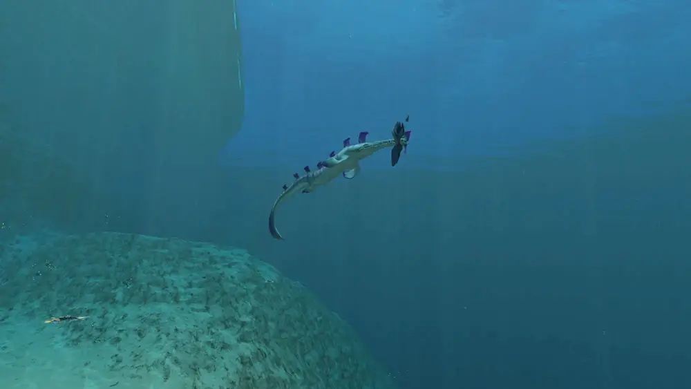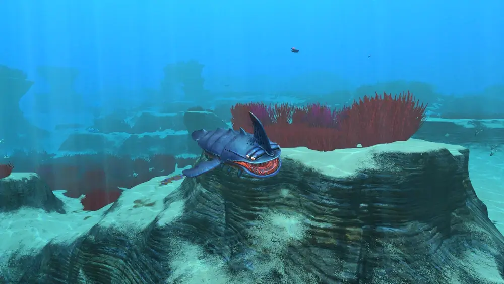 プレイヤーを発見するとスピードを上げて追いかけて非常に速く泳ぎ、溜めて噛みついてきます。かなり執拗に追いかけてきますが、攻撃が相手に当たると暫くの間興味を失って離れたところを泳ぎます。大人のゴーストリヴァイアサンはサイクロプスを押して動かしたりひっくり返したりすることがあります。多くの生物と同じく倒すとリスポーンしませんが…。