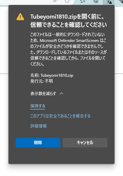 「信頼できるか確認してください」とのことですが、もちろん「つべよみ」は昔から存在する信頼できるモノなので、画像にある「保持する」をクリックします。